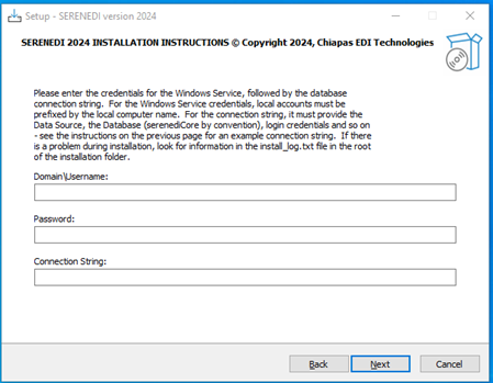 4. SQL Server connection string This defines the location and possibly the login credentials of the SQL Server account.  For different examples of the connection string, visit https://www.connectionstrings.com/sqlconnection/   This connection string will be used in conjunction with the supplied login credentials above to access the SQL Server specified above.  It will also specify the name of the distribution database – by convention, this is normally called ‘serenediCore’.